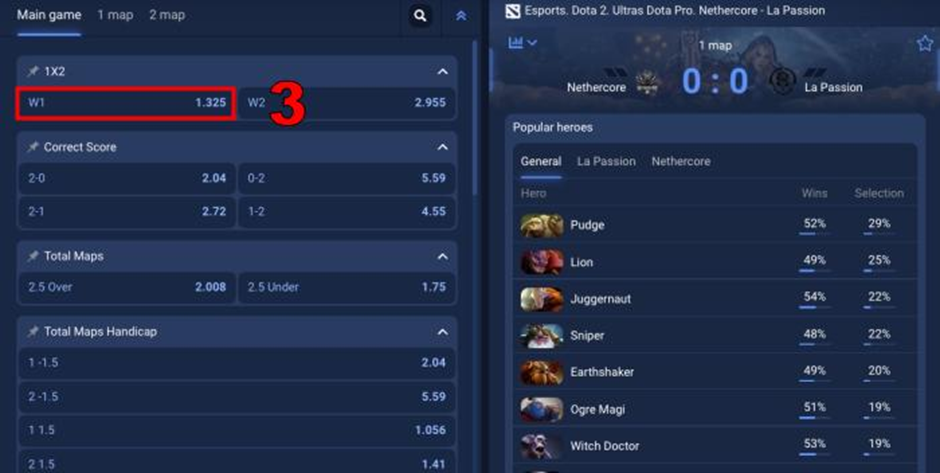 Step 2: For Dota 2 online betting on the Nethercore vs. Yangon La Passion match, we’ll select the 1×2 bet type and place a bet on W1 (Nethercore), which offers a payout of 1.325. Click on this and the system will automatically display the betting slip.