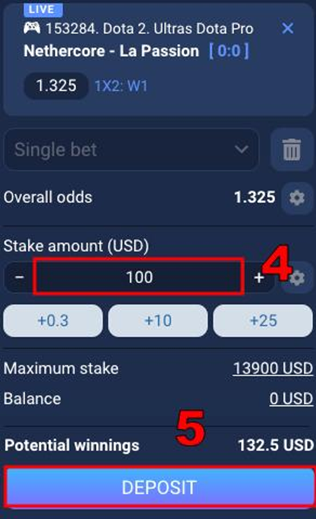 Step 3: Enter the amount you wish to bet, for example, enter 100 USD. The Dota 2 online betting system will automatically calculate your winnings. Then, click the “Deposit” button to place your bet. If the full-time match ends with Nethercore winning, the player will profit 132.5 USD.