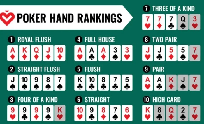 • Straight Flush – 5 cards in sequence and the same suit, such as 9♥️, 8♥️, 7♥️, 6 ♥️, 5♥️